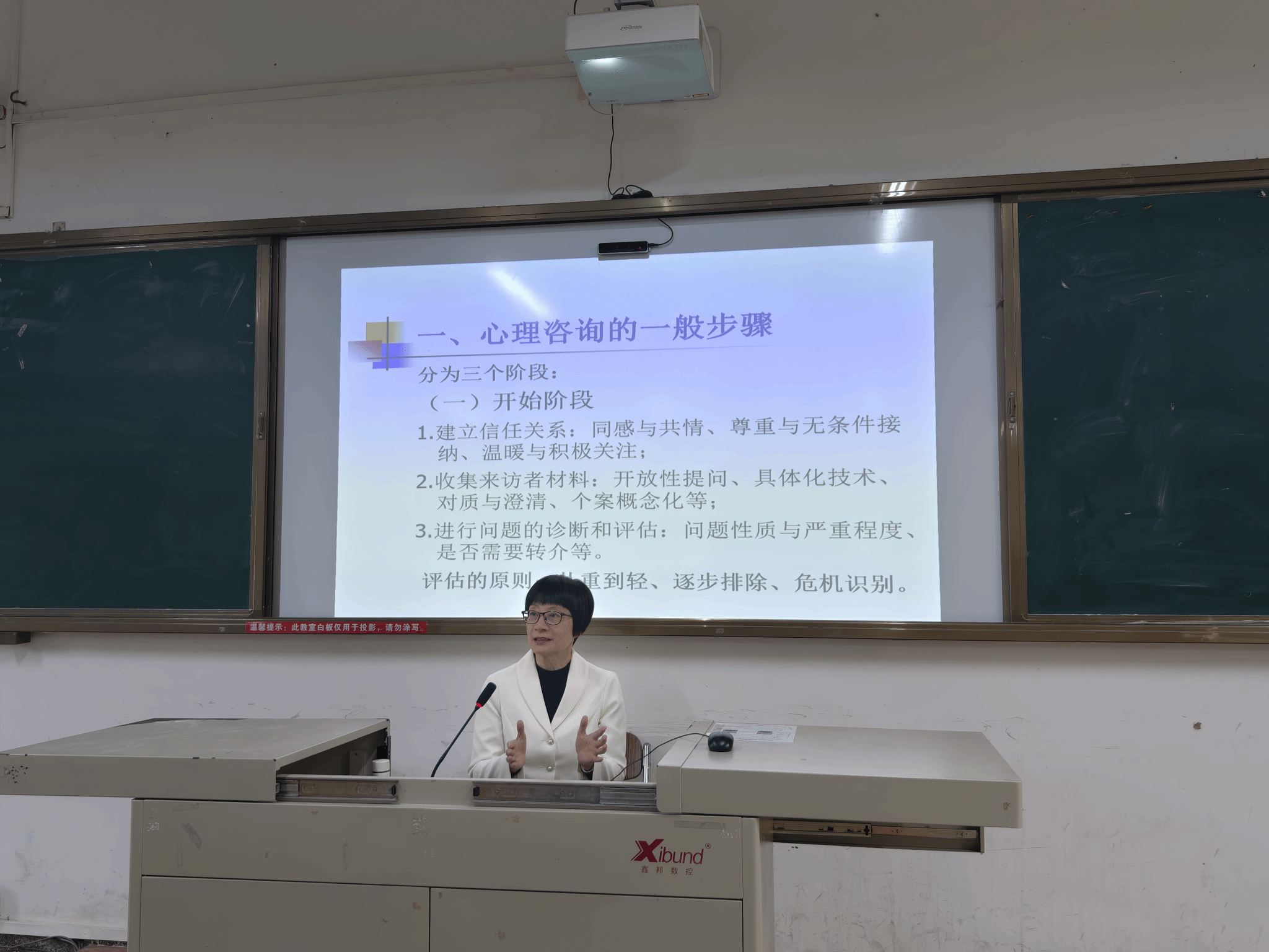 讲座伊始,王玲教授详细阐述了心理咨询的一般步骤,将其分为开始、指导与帮助、巩固和结束三个阶段,并深入解读每个阶段的关键要点,如开始阶段需建立信任关系、收集材料和进行问题诊断评估等。这让同学们对心理咨询的流程有了系统的认识,为日后实践打下坚实基础。