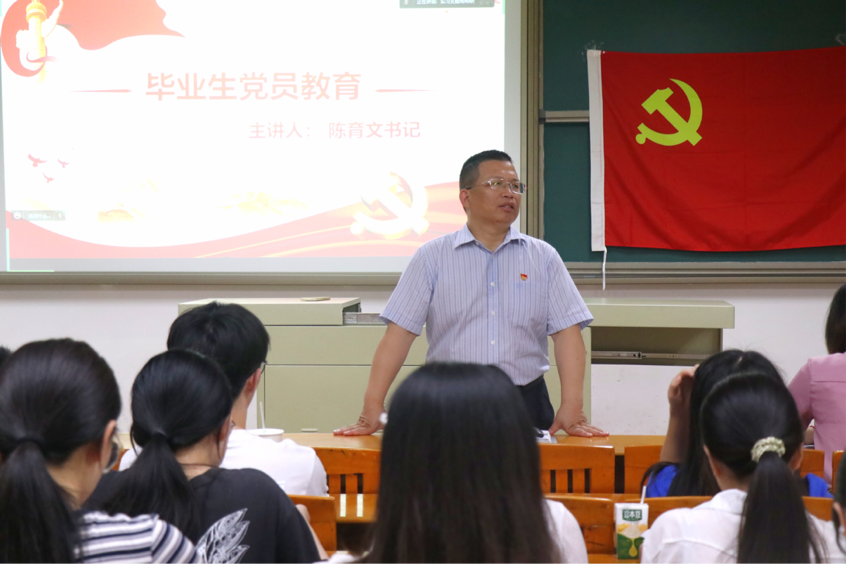 随后,陈育文书记对我院党员提出五点要求。一是不忘初心、牢记使命,做到全心全意为人民服务;二是加强学习,提高党性修养,坚定理想信念;三是勇担重任,做好表率,起到先锋模范作用;四是敢于创新,超越自我,面对困难不退缩;五是戒骄戒躁,踔厉奋发,争取成为新时代高素质人才。