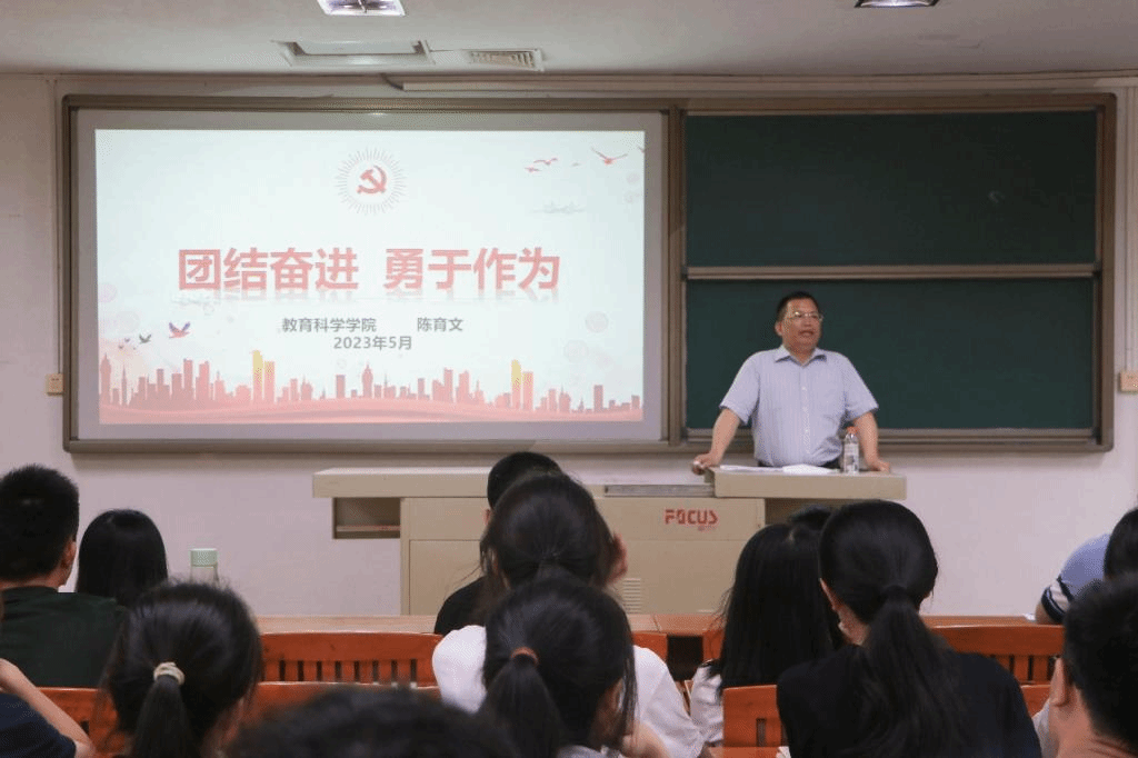 为深入贯彻党的二十大精神,进一步提高学生干部的思想觉悟。2023年5月18日,教育科学学院党委书记陈育文在李小平教育大楼201为学生干部开展了“团结奋进 勇于作为”的主题党课。