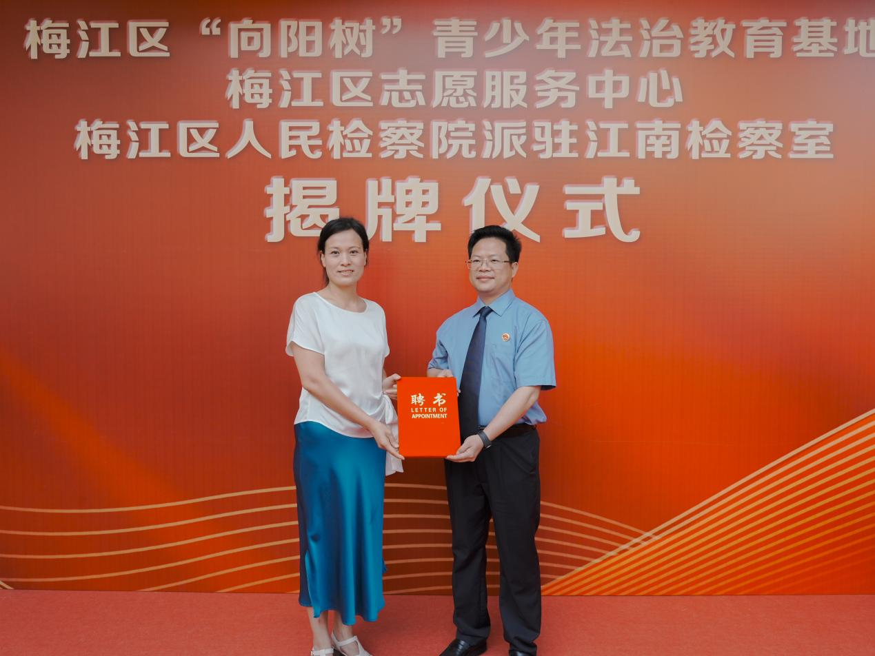 仪式开始前期,梅江区检察院党组书记、检察长黄国锐为嘉应学院教育科学学院心理学副教授刘幸娟颁发聘书。梅州市检察院副检察长金芃为梅江区未成年人心理健康辅导志愿服务队授旗。