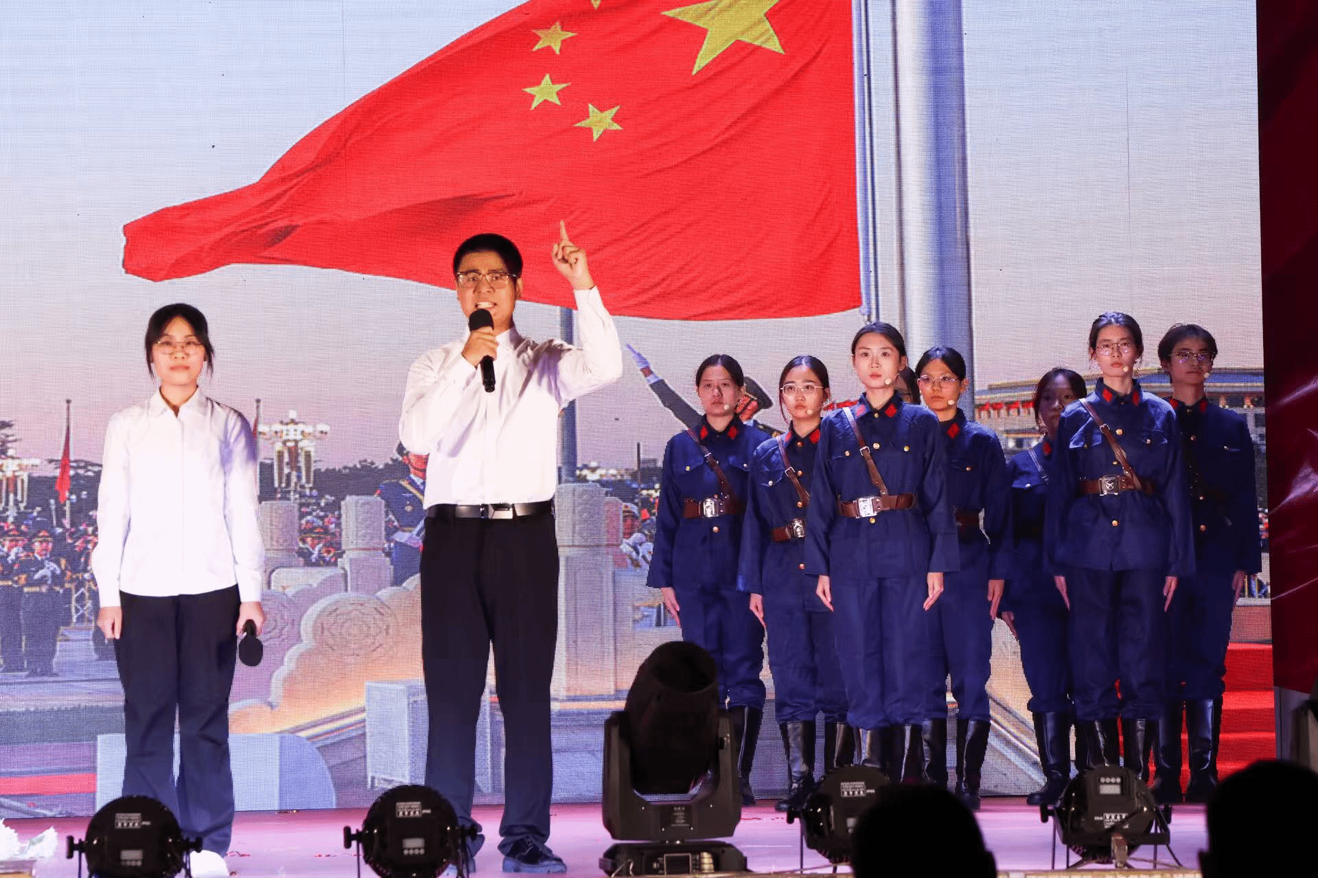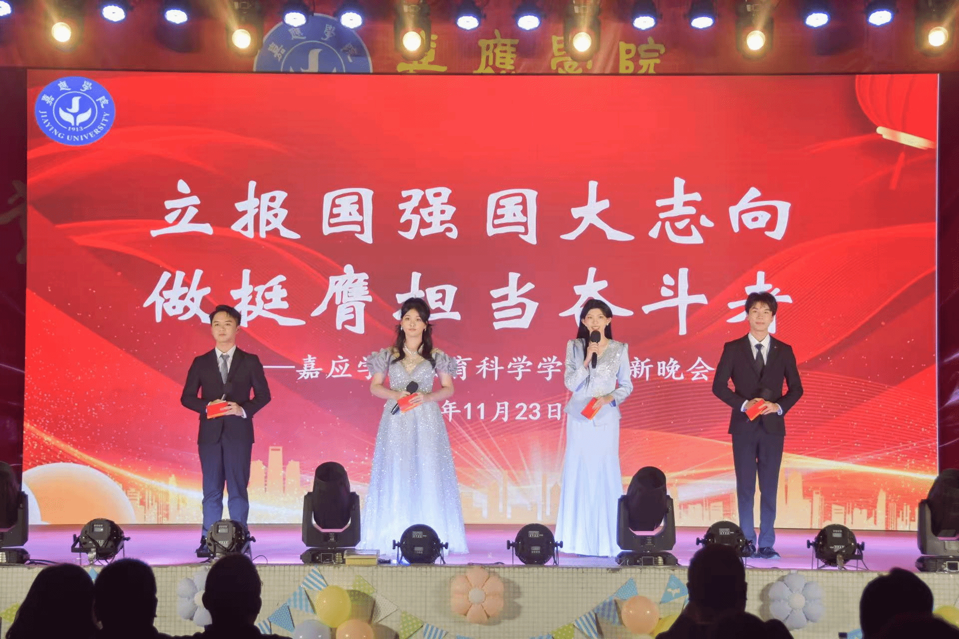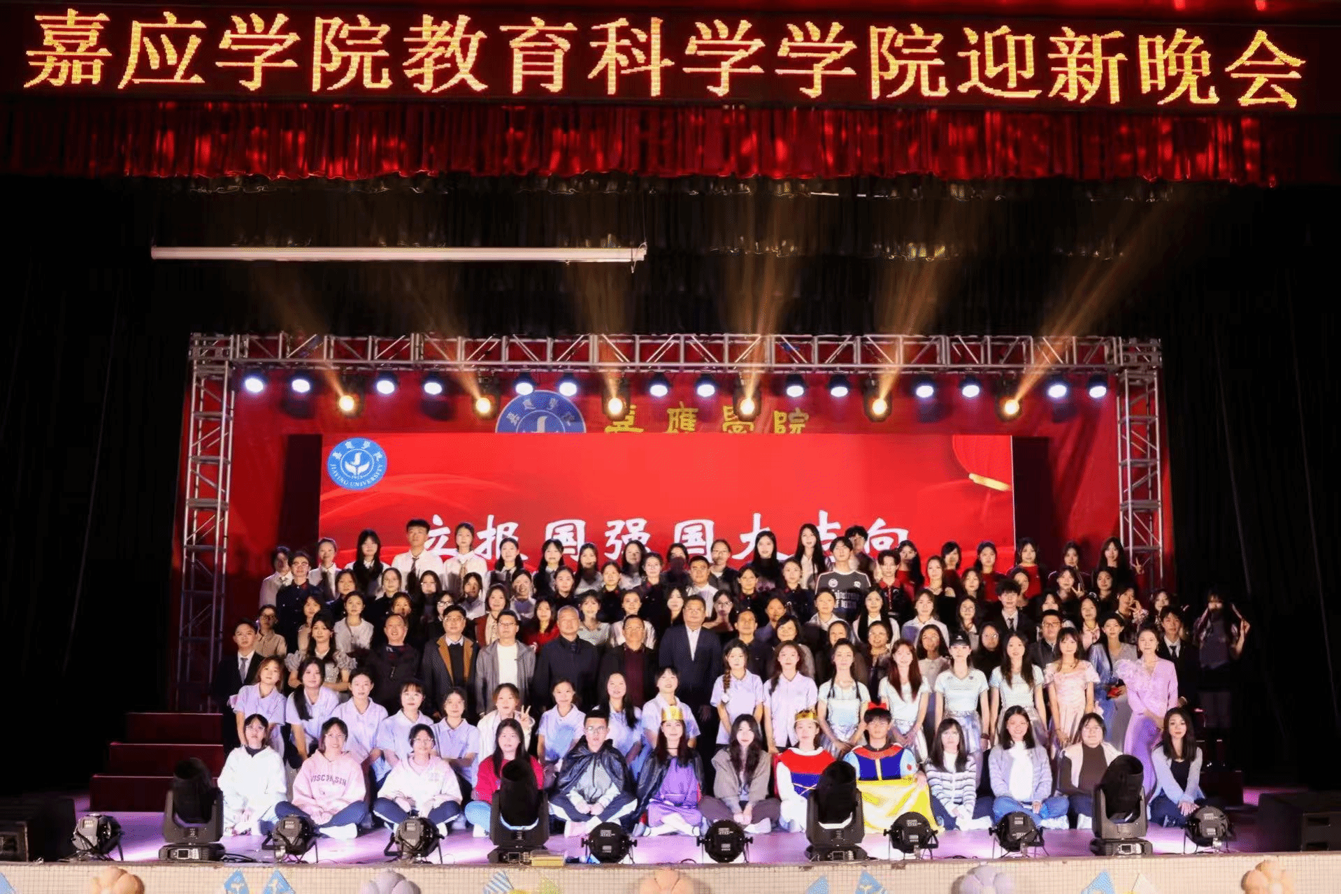 为迎接2025级新生加入教科院这个大家庭,暨迎接即将到来的充满希望的2026年新年,我院于11月23日晚在程江校区举行举行“立报国强国大志向·做挺膺担当奋斗者”主题迎新晚会。校团委张敏书记、廖莹莹副书记,教师教育学院杨丽媛副院长、文学院刁清利副书记、经管学院张莺莺副书记,教科院院领导,教科院24级、25级学生共1000多人观看了晚会。