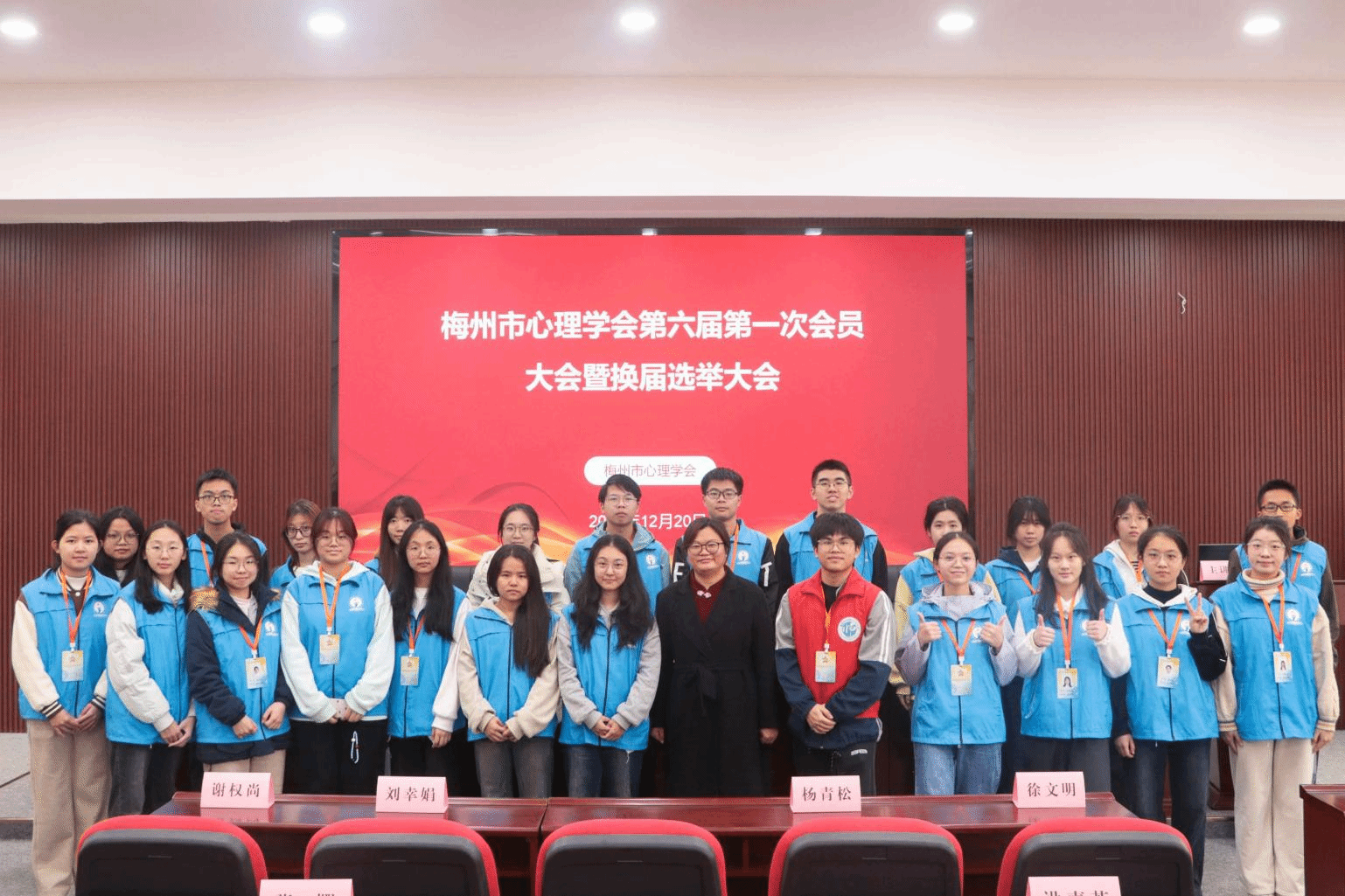 2025年12月20日,梅州市心理学会第六届第一次会员大会暨换届选举大会、2025年学术年会在嘉应学院程江校区校友报告厅顺利召开。为确保会议顺利进行,学院辅导员赵顺英带领25名志愿者积极投身服务,为大会提供了全方位保障。