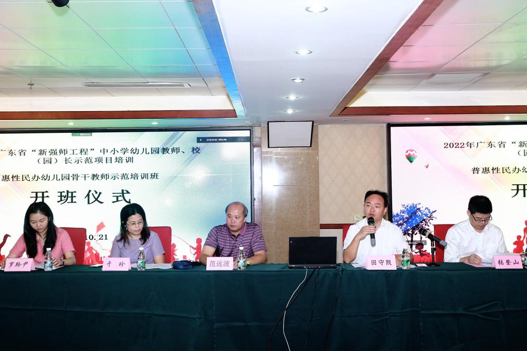 10月21日上午,2022年广东省“新强师工程”普惠性民办幼儿园骨干教师示范培训班开班典礼在我校举行。校教师发展中心副主任田守凯、项目承办单位教育科学学院的领导、项目首席专家及相关教师参加了开班典礼。田守凯副主任代表学校及教师发展中心向大家表示热烈的欢迎,并向各位学员介绍了嘉应学院教师教育发展中心的概况,同时向学员提出了几点要求:要求学员们在学校珍惜学习机会,遵守培训纪律,回到幼儿园能发挥引领、辐射和示范作用。