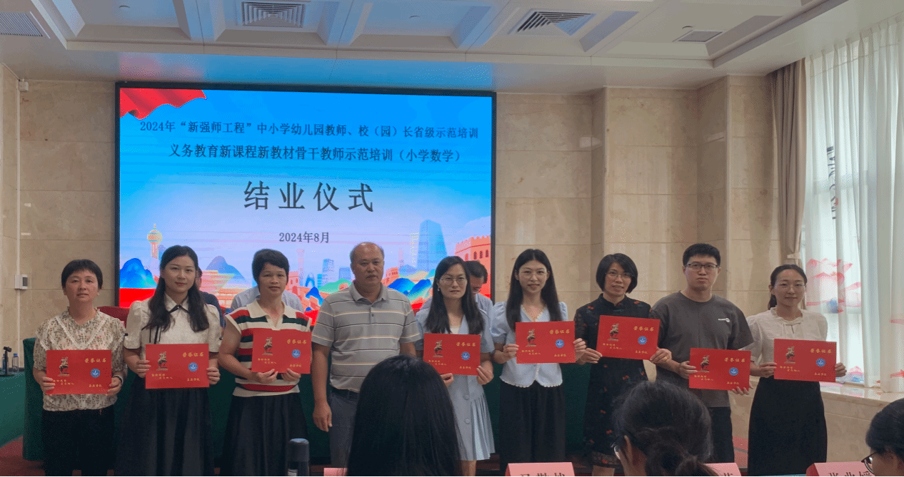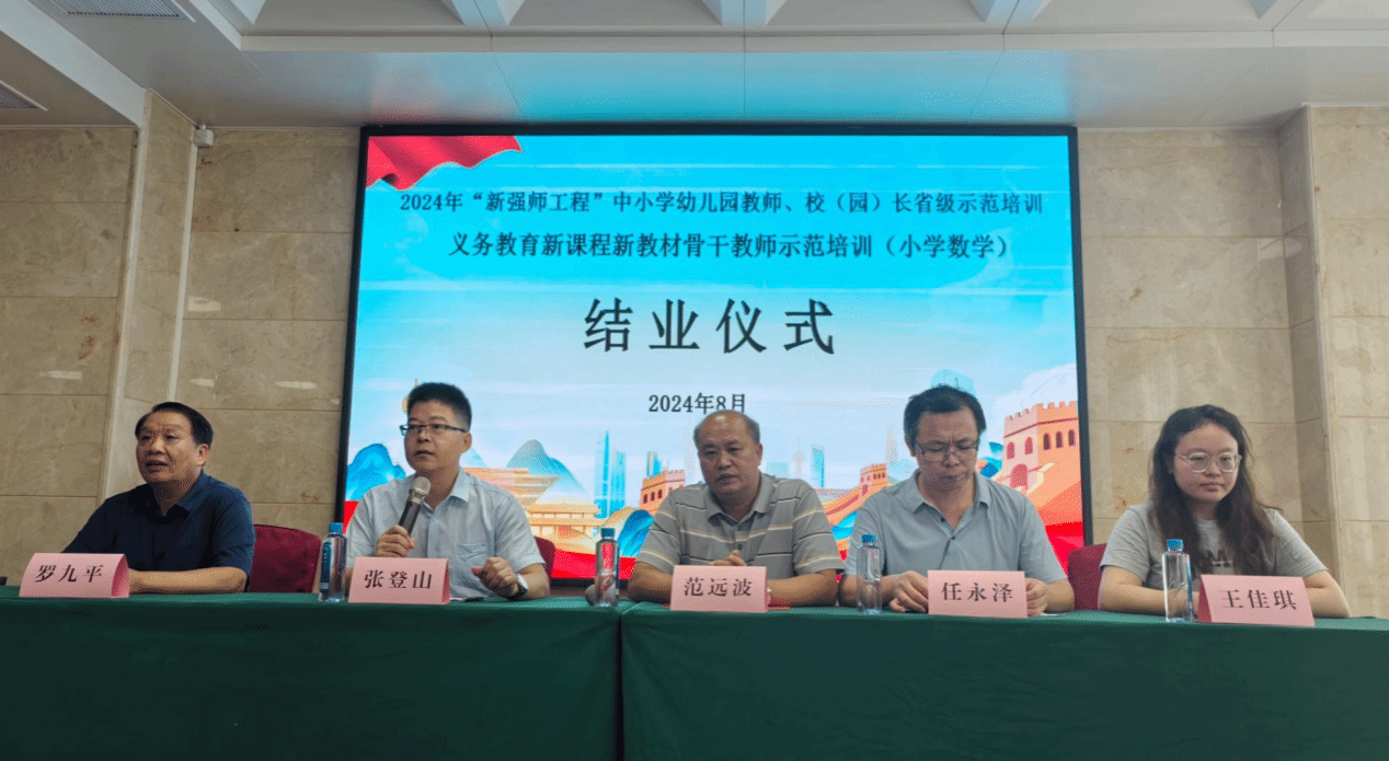 2024年8月21日,2024年“新强师工程”中小学幼儿园教师、校(园)长省级示范培训义务教育新课程新教材骨干教师示范培训(小学数学)结业仪式在梅州市强华陋室酒店顺利举行,结业仪式由教育科学学院副院长张登山主持,教育科学学院院长范院波、项目首席专家任永泽博士、项目组成员罗九平副教授以及来自广东省各市(县、区)的100名学员参加。