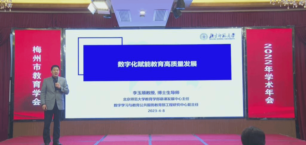 会议第二阶段由北京师范大学教育技术学院教授、教育学部慕课发展中心李玉顺主任开展以“数字化赋能基础教育高质量发展”为主题的学术讲座,提出当前课堂正走向深层次系统性变革阶段,这种变革不仅局限于各个学校、各个区域,而是更广泛的区域凝聚、共生。“互联网+教研”会更加广泛提升师生数字化能力,推动混合教研、实证教研、合作教研发展,并进一步走向情景化、伴生性及自下而上生成性的教研,为梅州市教育发展的资源平台搭建提供了更多的思路。