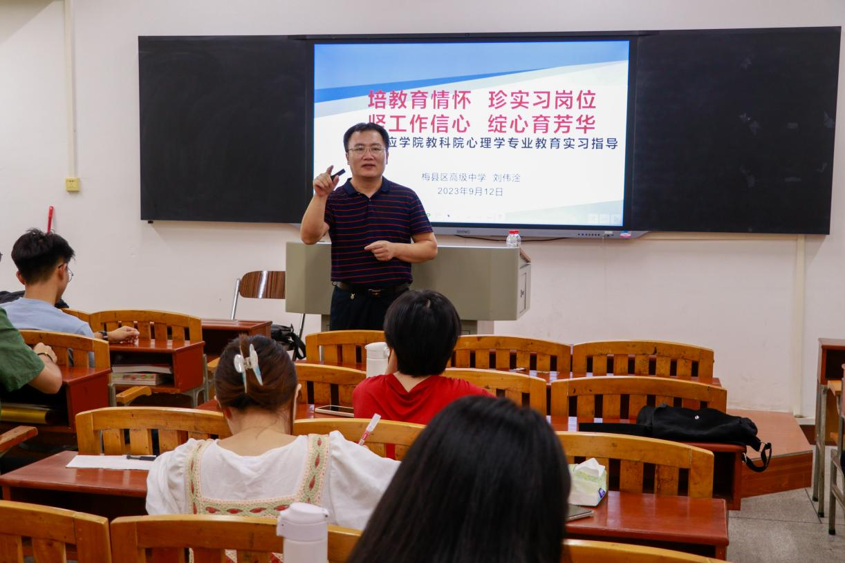 为确保学院心理学专业学生教育实习工作的顺利开展,9月12日下午,我院在小平楼502室开展心理学专业实习培训讲座,由梅县区高级中学刘伟淦老师担任主讲人,学院心理学专业学生参加此次讲座。