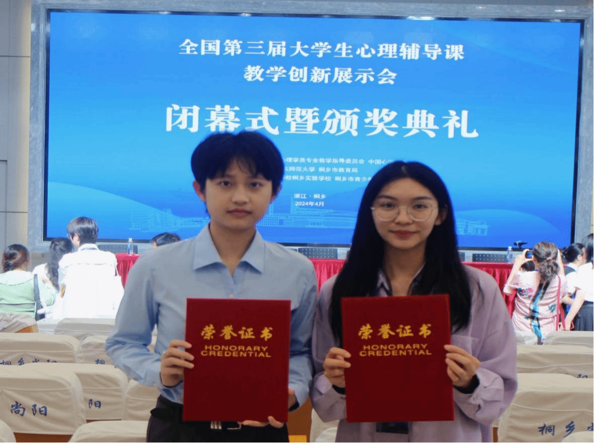 近日,我校教育科学学院2021级学生蔡欣和列语翎在全国第三届大学生心理辅导课教学创新展示会上分别荣获一等奖和二等奖。在本次赛场上,两位选手以卓越的表现,充分展现了他们在心理辅导说课、备课以及教学展示等方面的创新能力和专业素养,这不仅是个人荣誉,也是我校心理学教学改革成效的体现。